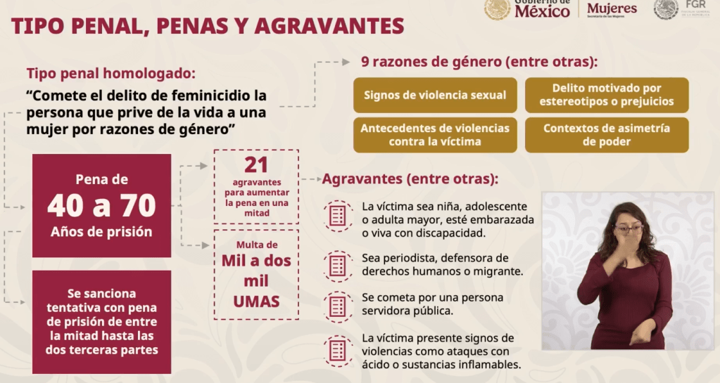 Esta obliga a investigar, impulsa la construcción de un marco jurídico, establece de 40-70 años de prisión, y entre las agravantes se encuentra los siguientes puntos: Que la mujer sea niña, adolescente o adulta mayor. Periodista, defensora de derechos o migrante. Que el delito sea cometido por una persona funcionaria pública. También se cataloga como agravante tener signos de ataque con inflamables o ácido, realizar el delito delante de hijas e hijos. Entre otras.